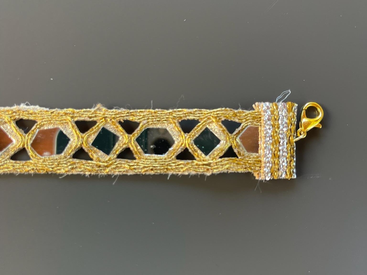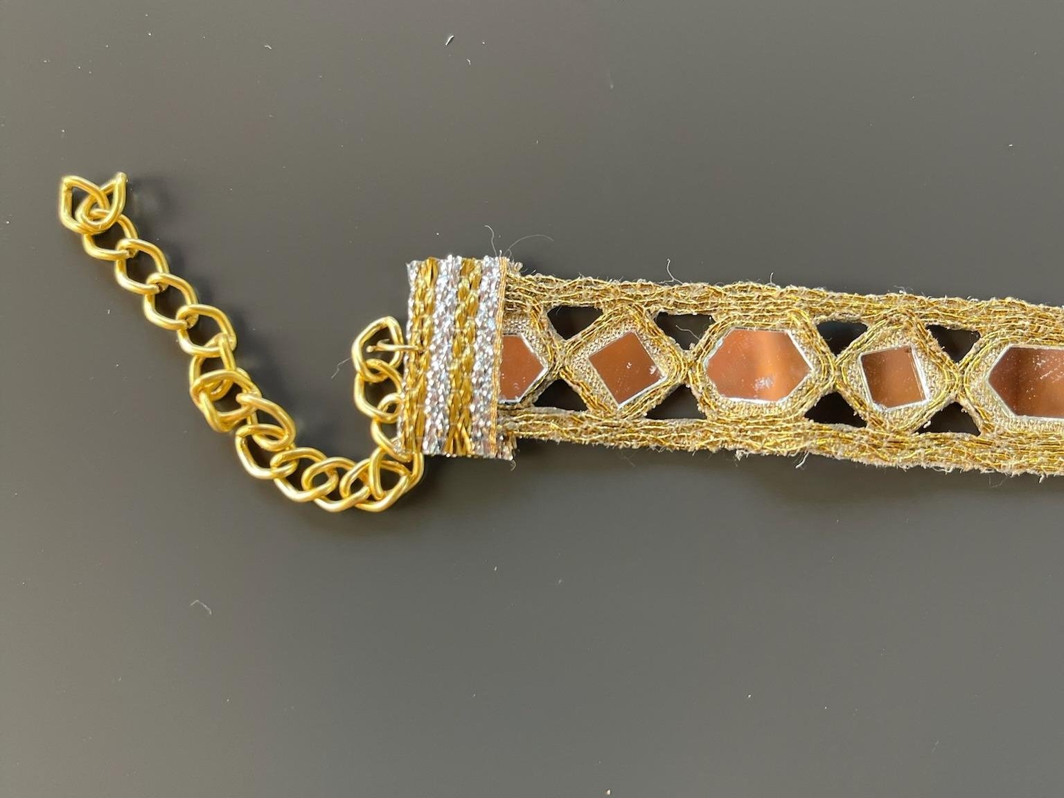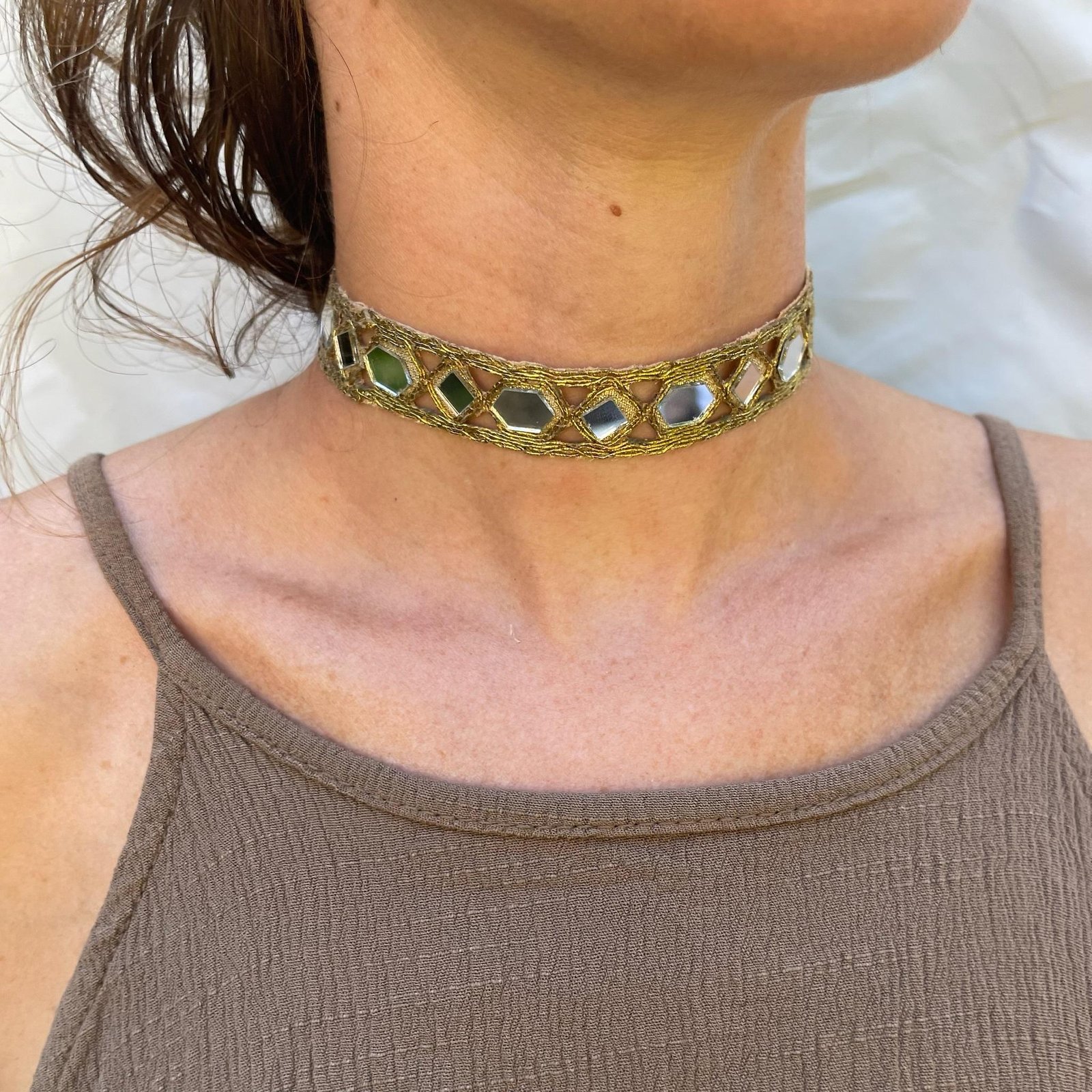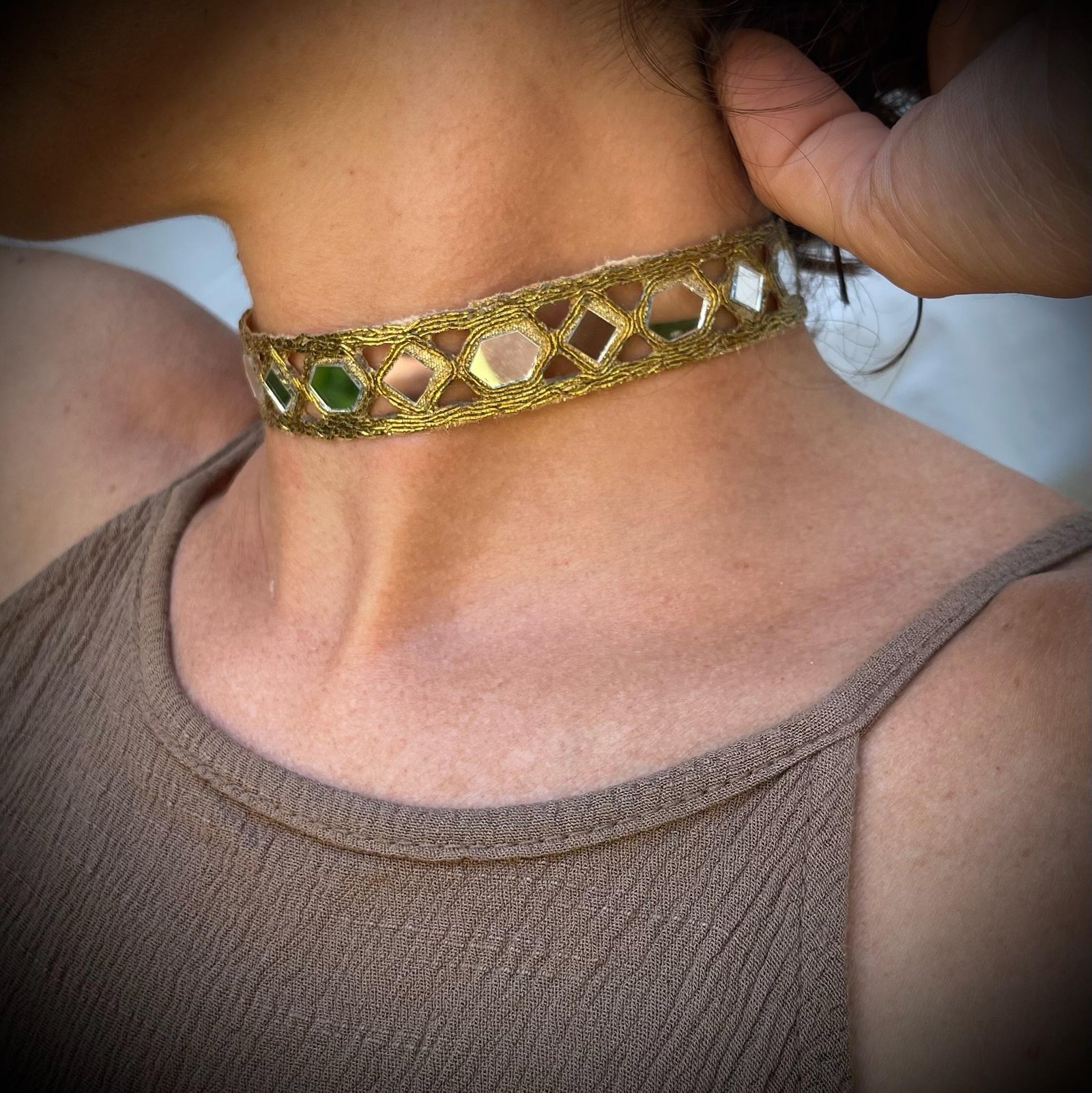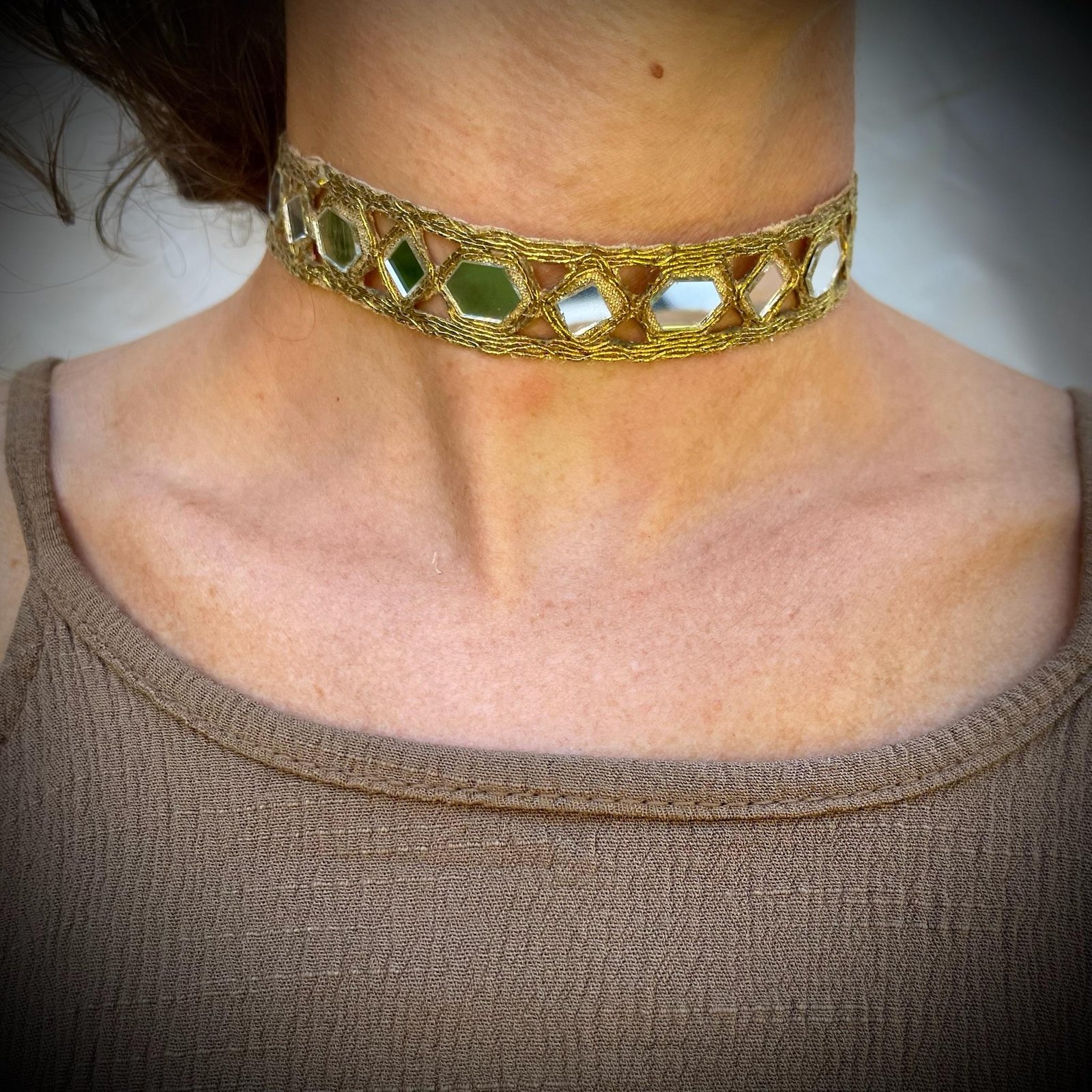Este Choker Dorado de Hexágonos con Espejos es una pieza artesanal diseñada para destacar. Elaborado a mano con hilos dorados y pequeños espejos incrustados en formas geométricas, crea un efecto luminoso que atrae miradas al instante. Su estilo boho étnico lo convierte en el complemento ideal tanto para looks diarios con personalidad como para eventos donde quieras añadir brillo con elegancia.