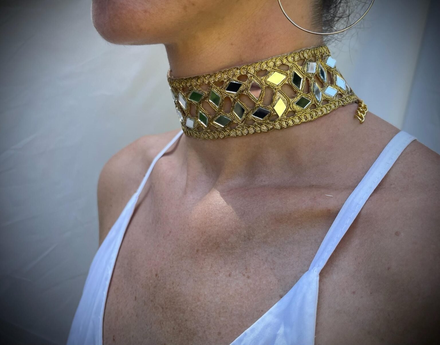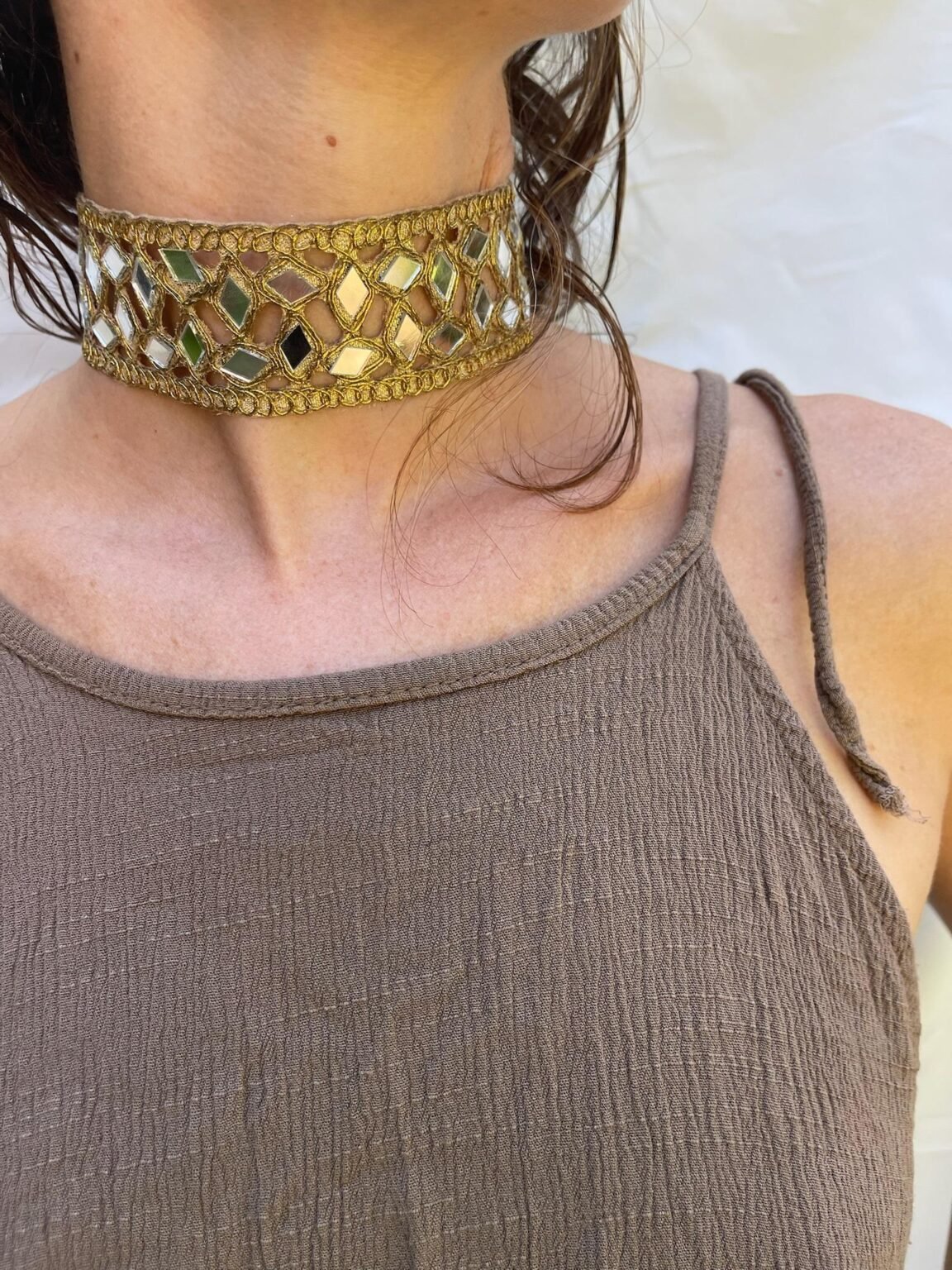 Brilla con estilo con este choker artesanal de diseño geométrico. Hecho a mano con hilos dorados y espejos en forma de rombos, es ligero, ajustable y perfecto para elevar cualquier outfit. Ideal para eventos o para dar un toque sofisticado a tu look diario. ¡Refleja tu elegancia en cada detalle!