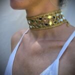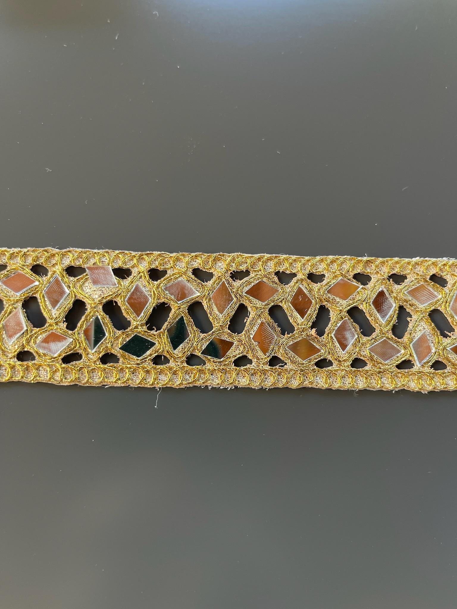 Deslumbra con el brillo elegante de nuestro Choker de Rombos Dorado con Espejos. Esta pieza artesanal combina el encanto del diseño geométrico con el resplandor del dorado clásico. Elaborado a mano con hilos dorados y espejos incrustados en forma de rombos, refleja la luz de manera única.
