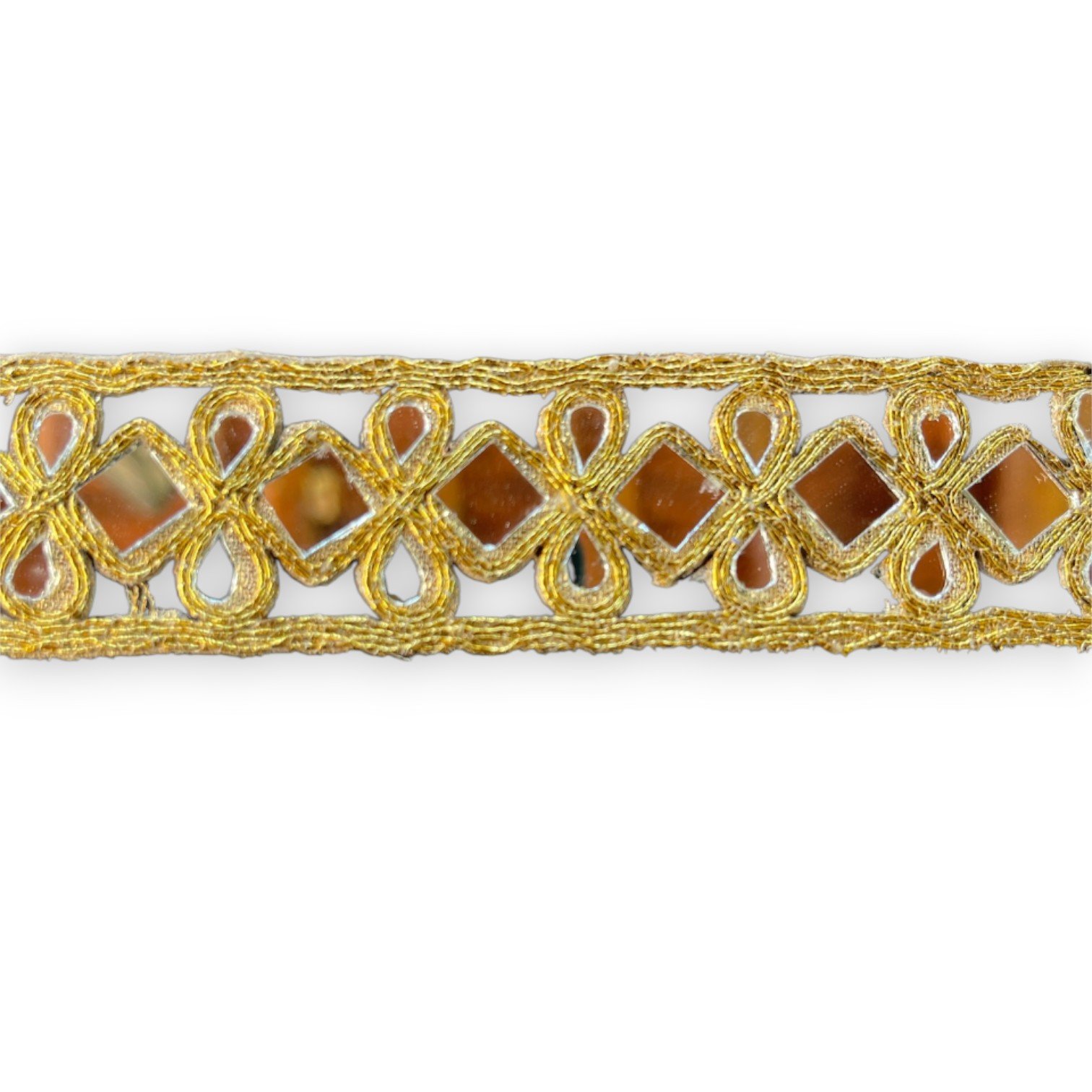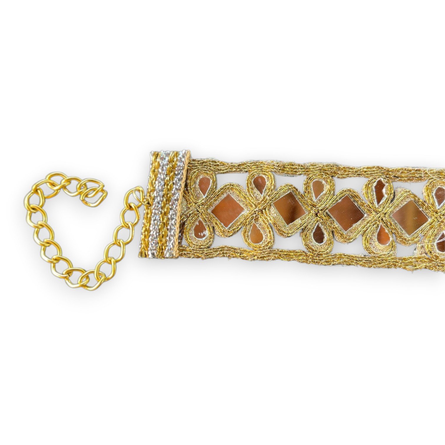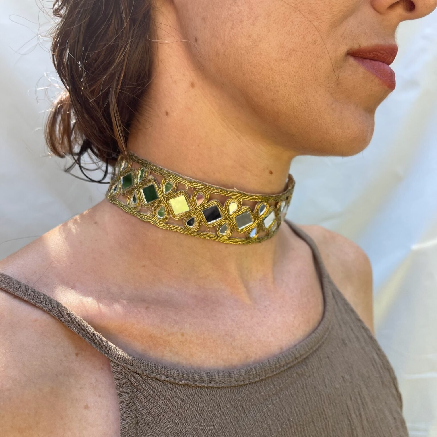 El Choker Dorado Gotas y Rombos con Espejos es una joya artesanal que combina el brillo del dorado con la sutileza de los reflejos en espejo. Su diseño entrelaza formas de gotas y rombos bordadas con hilo dorado, creando un patrón elegante y armonioso que se adapta suavemente al contorno del cuello. Cada pequeño espejo capta la luz y la refleja con un destello único, aportando luminosidad y sofisticación a cualquier look.