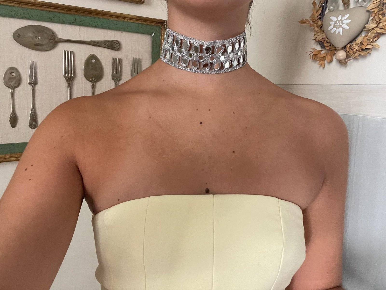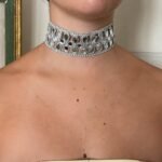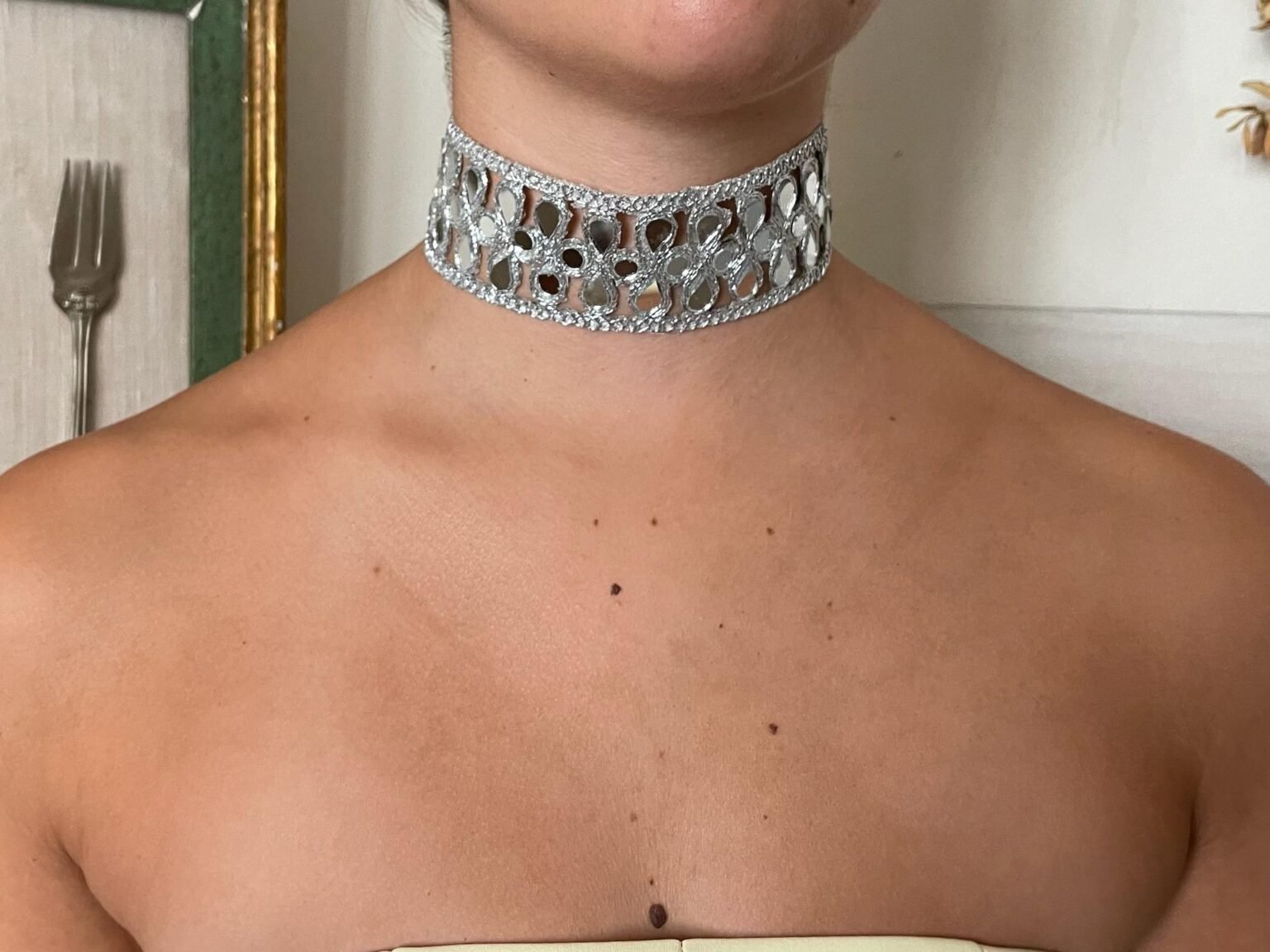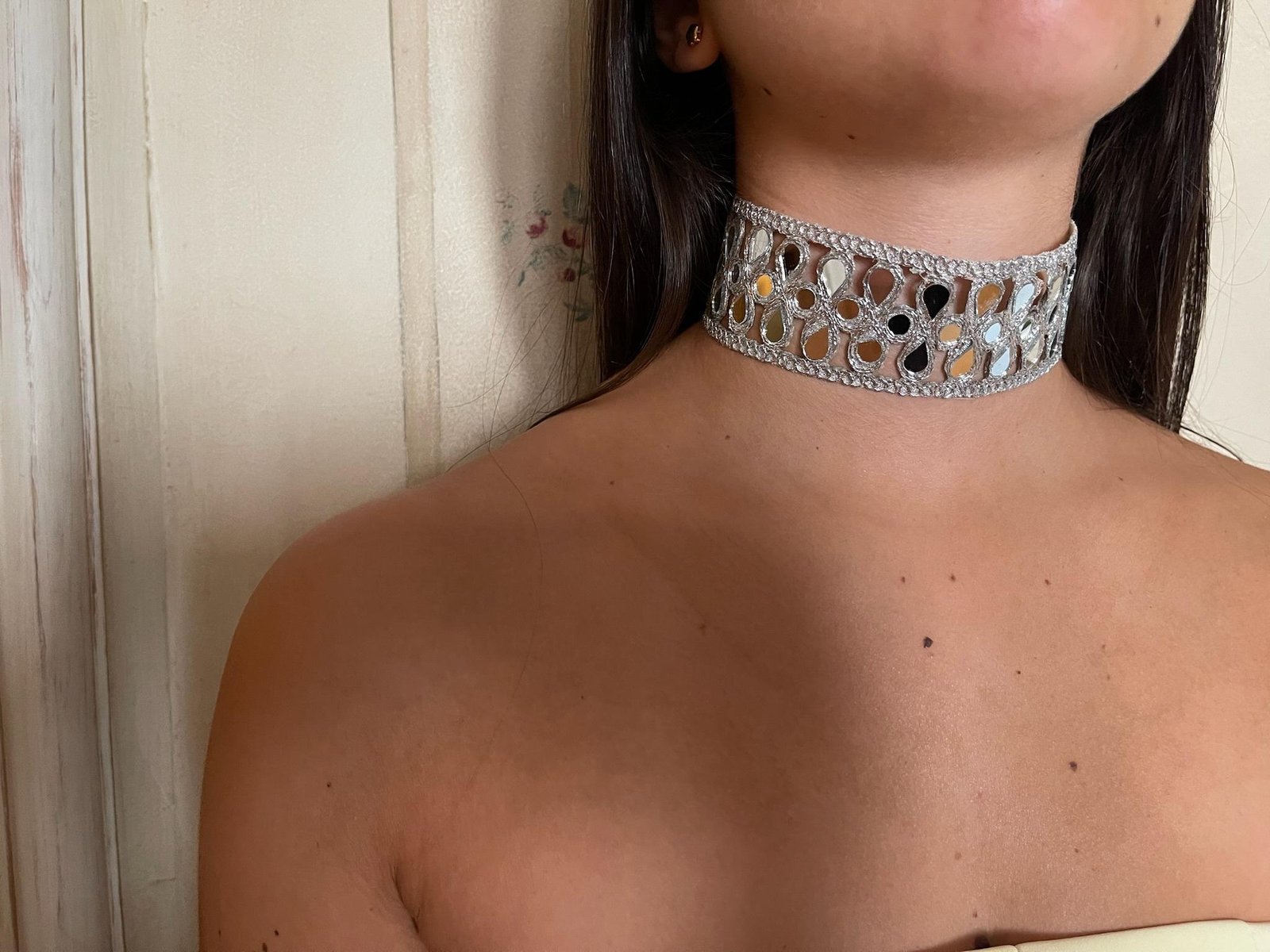 El Choker Plateado Gotas con Espejos es una pieza que fusiona delicadeza y brillo en un diseño cautivador. Elaborado en tono plateado, presenta una serie de pequeñas figuras en forma de gota decoradas con espejos que reflejan la luz con cada movimiento, aportando un efecto luminoso y elegante al cuello.