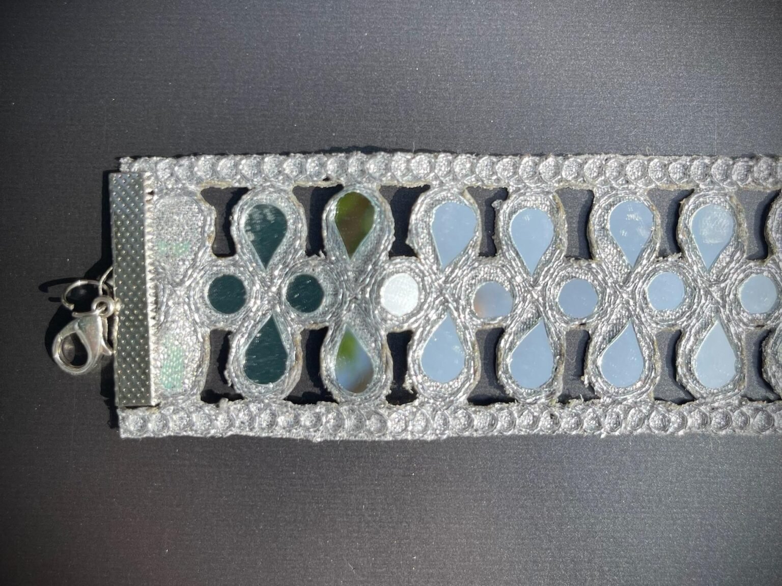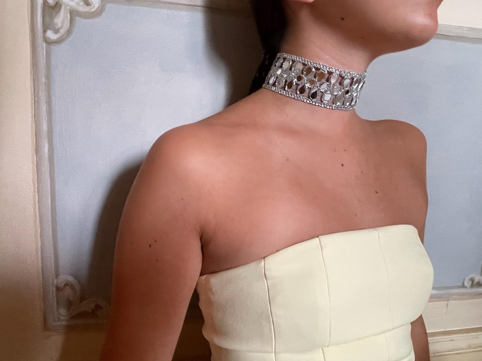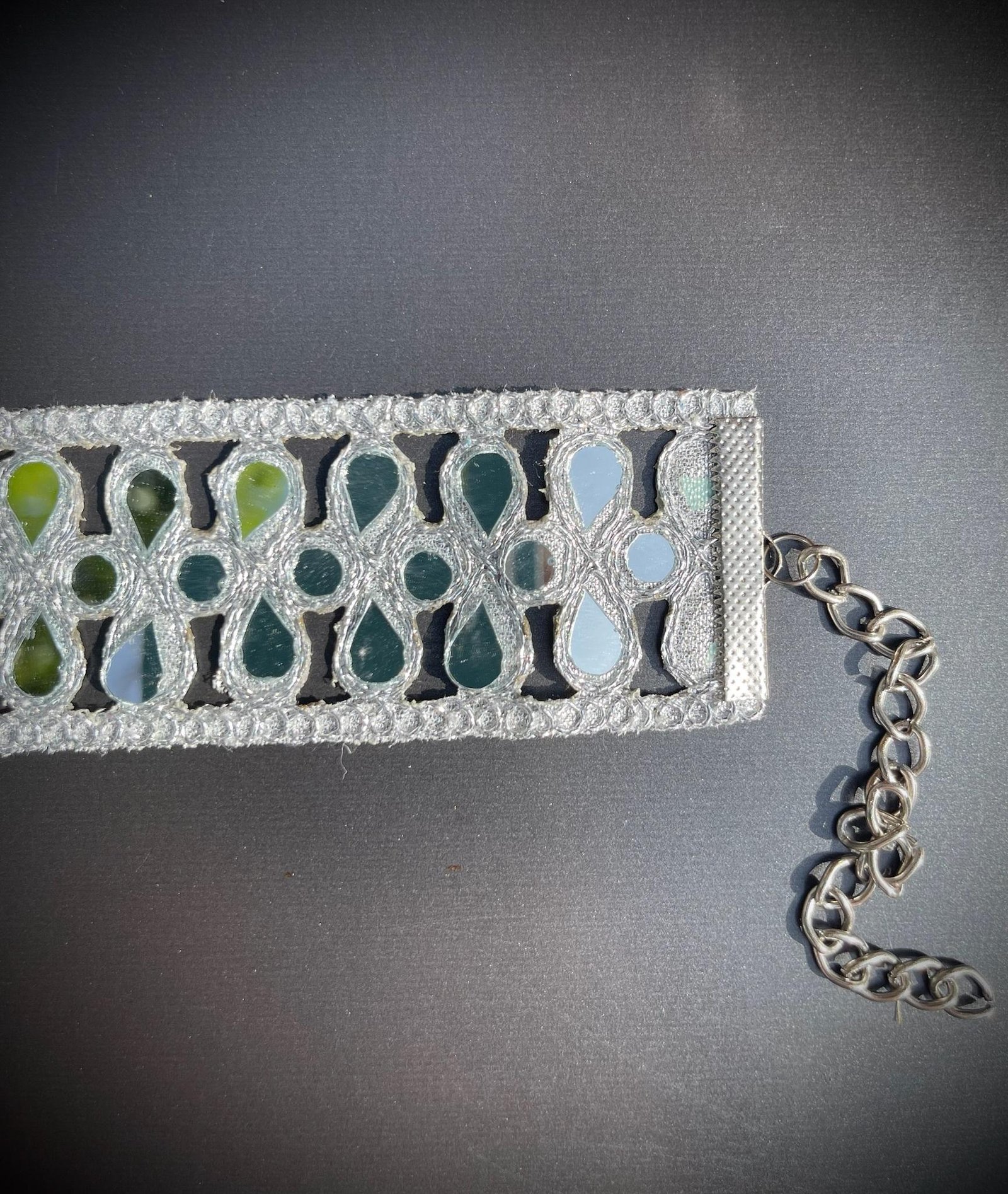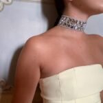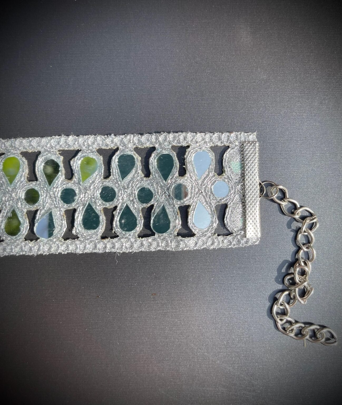 El Choker Plateado Gotas con Espejos es una pieza que fusiona delicadeza y brillo en un diseño cautivador. Elaborado en tono plateado, presenta una serie de pequeñas figuras en forma de gota decoradas con espejos que reflejan la luz con cada movimiento, aportando un efecto luminoso y elegante al cuello.