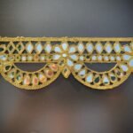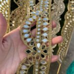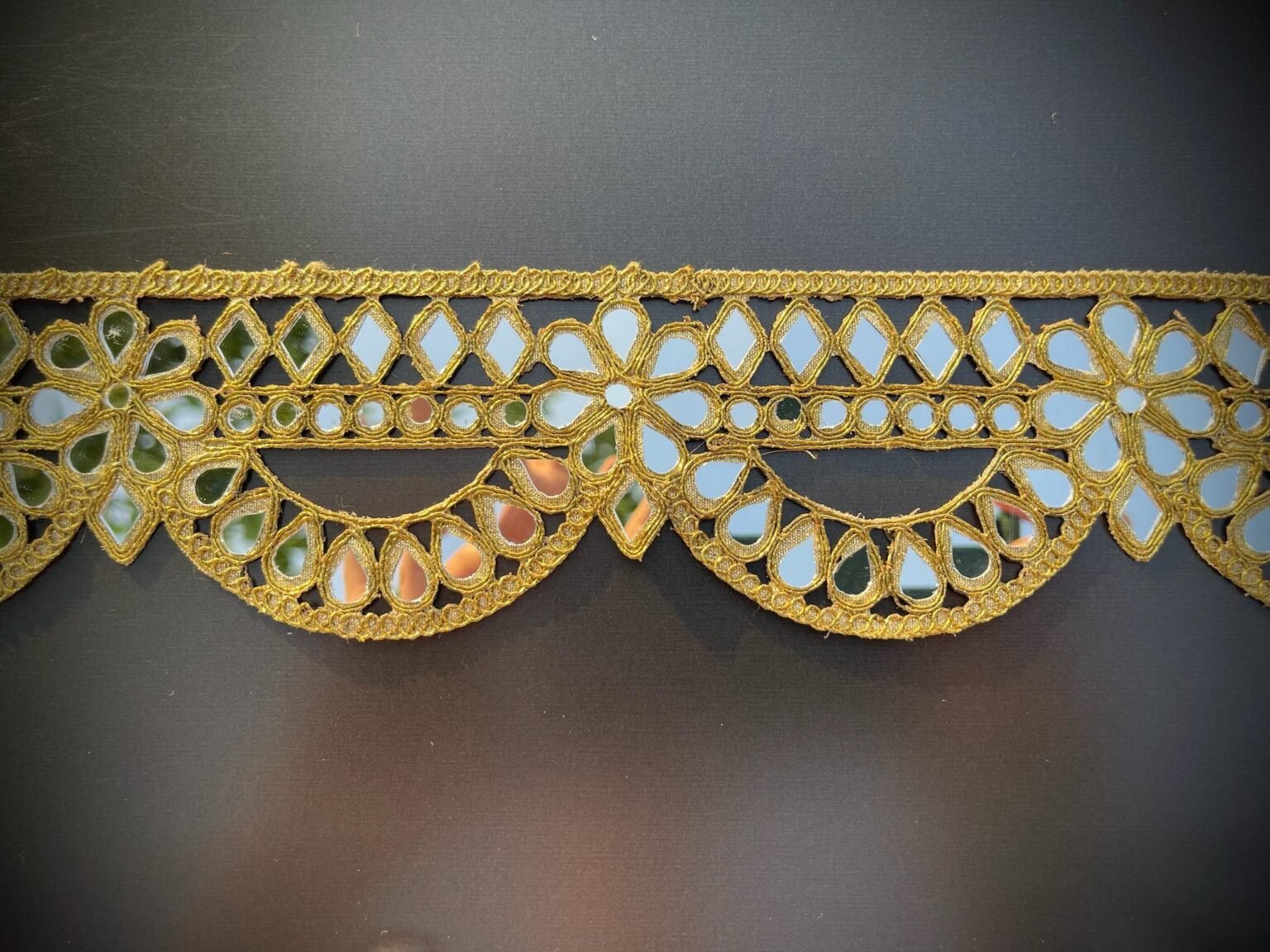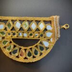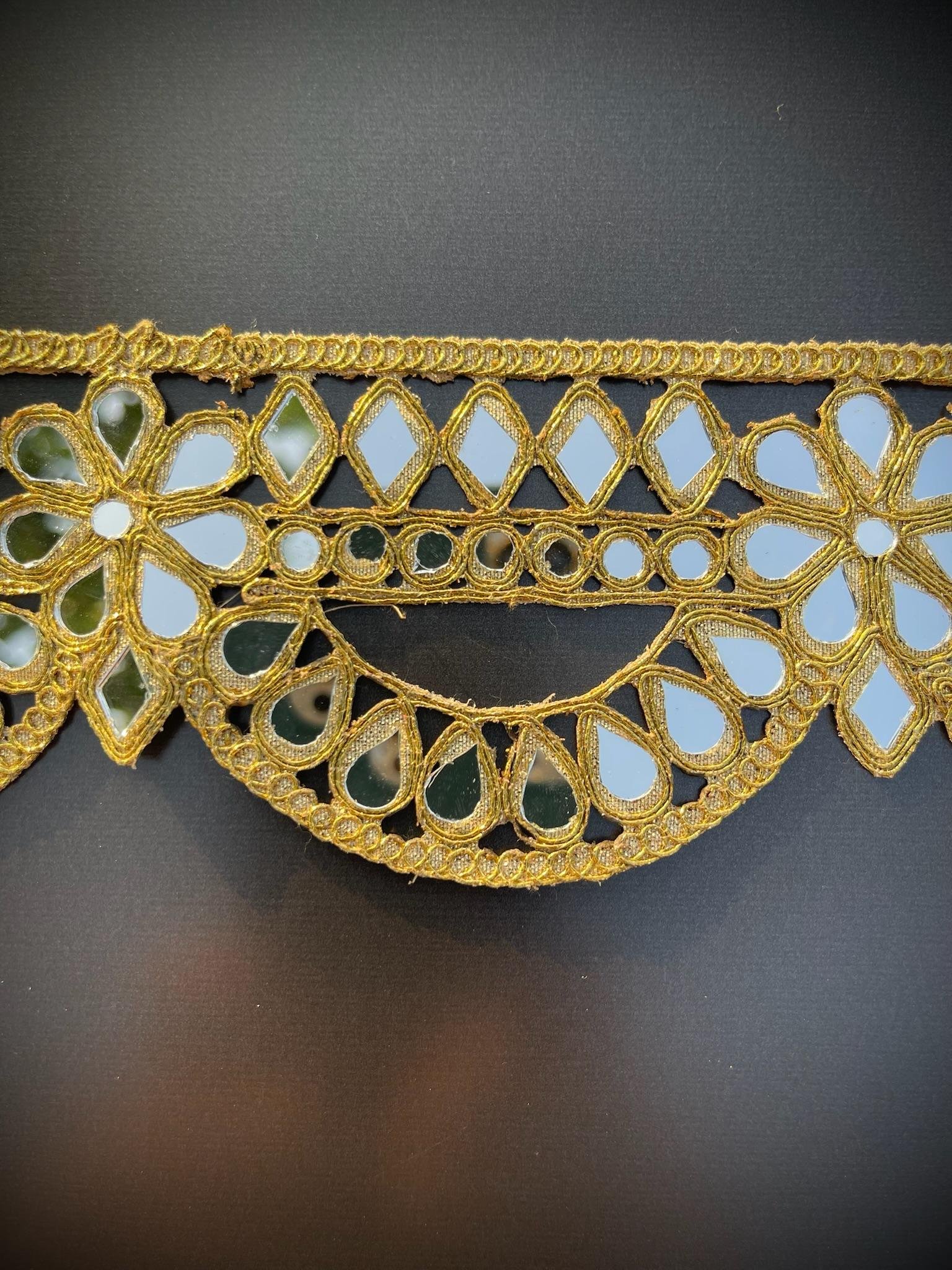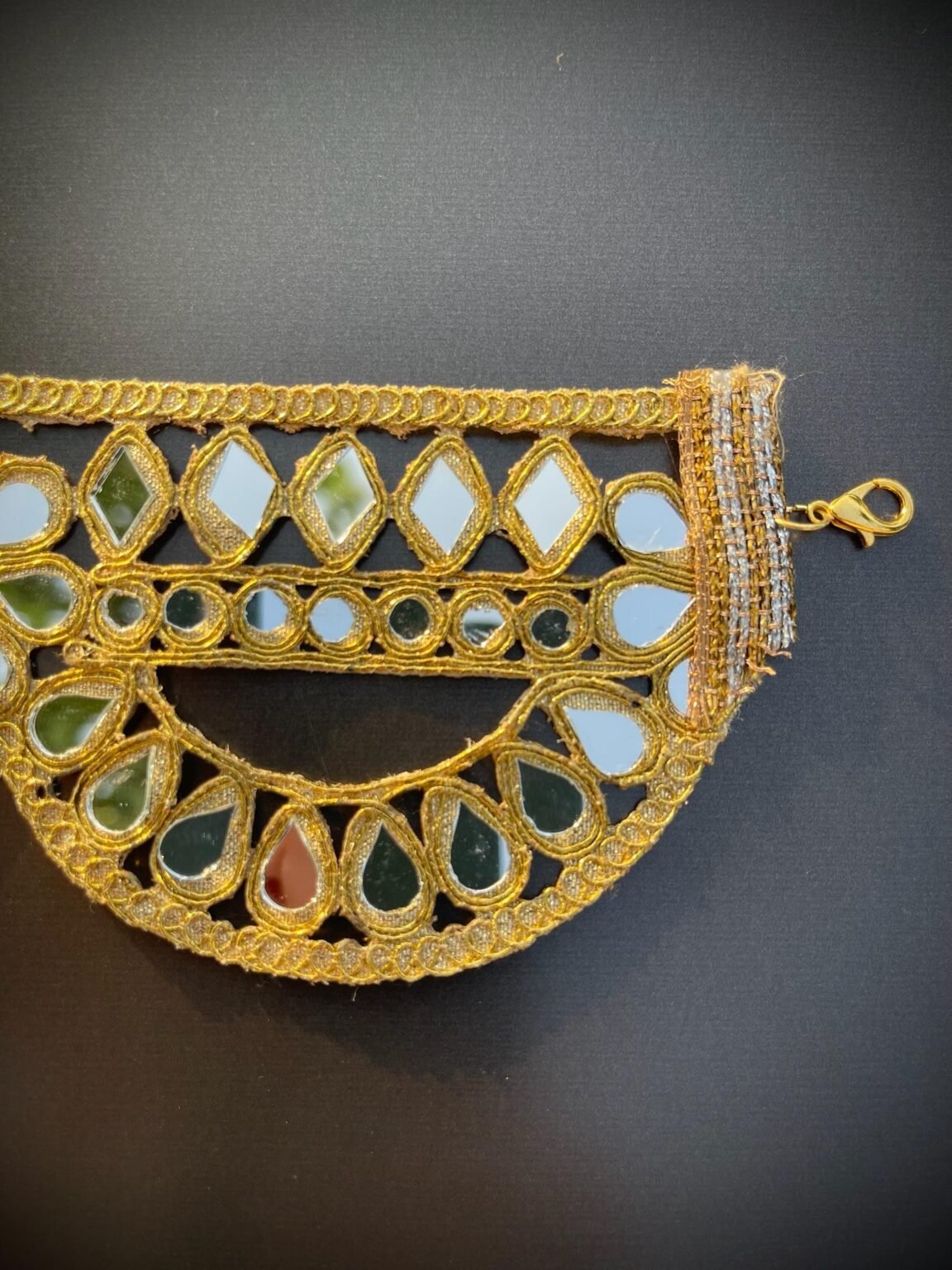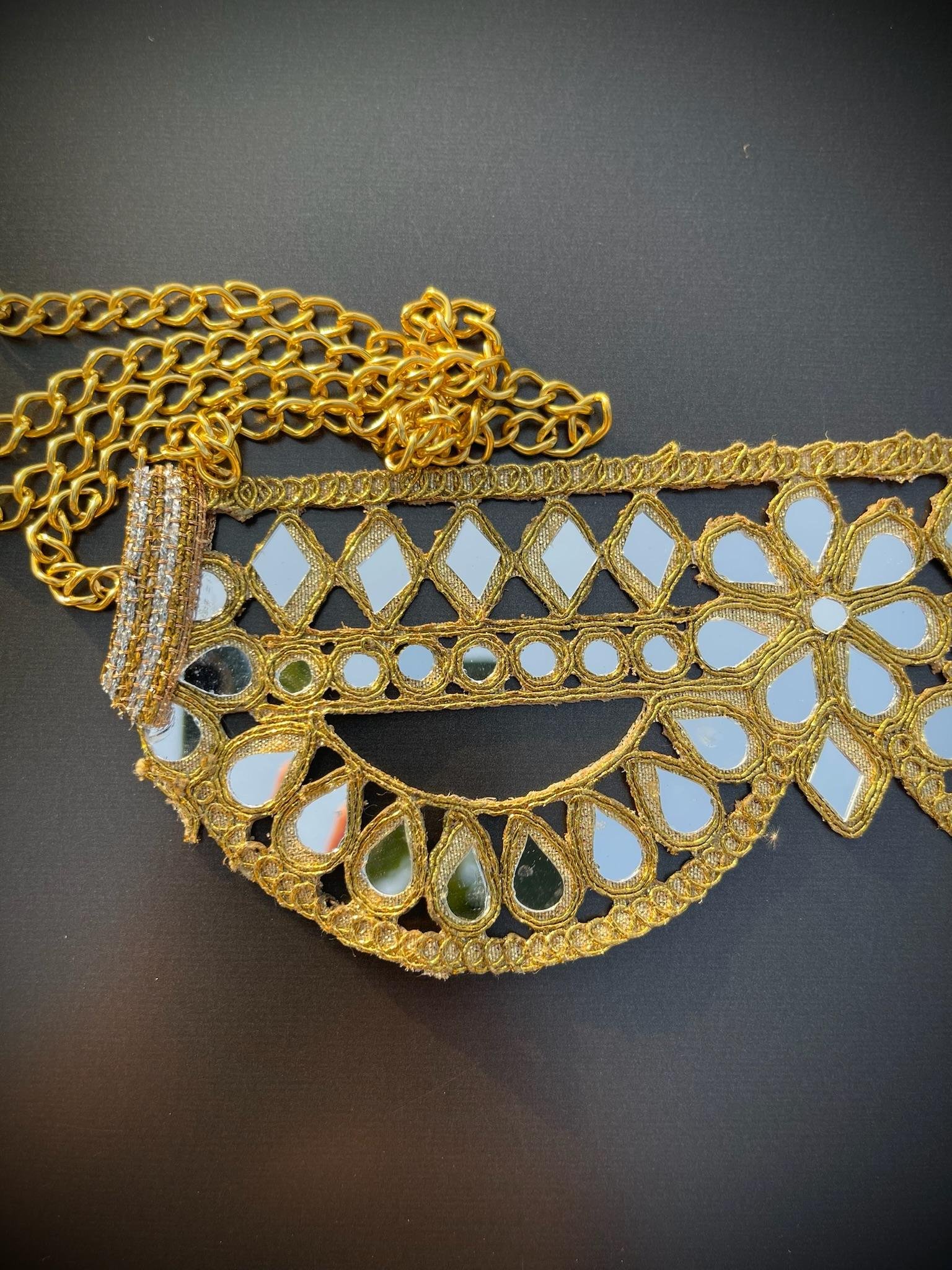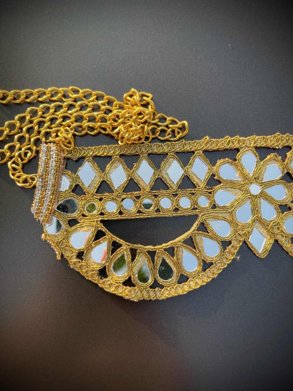 • Material: Base de tela con bordado dorado, espejos pequeños y cadena dorada