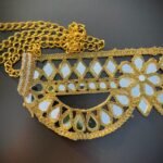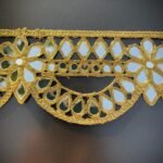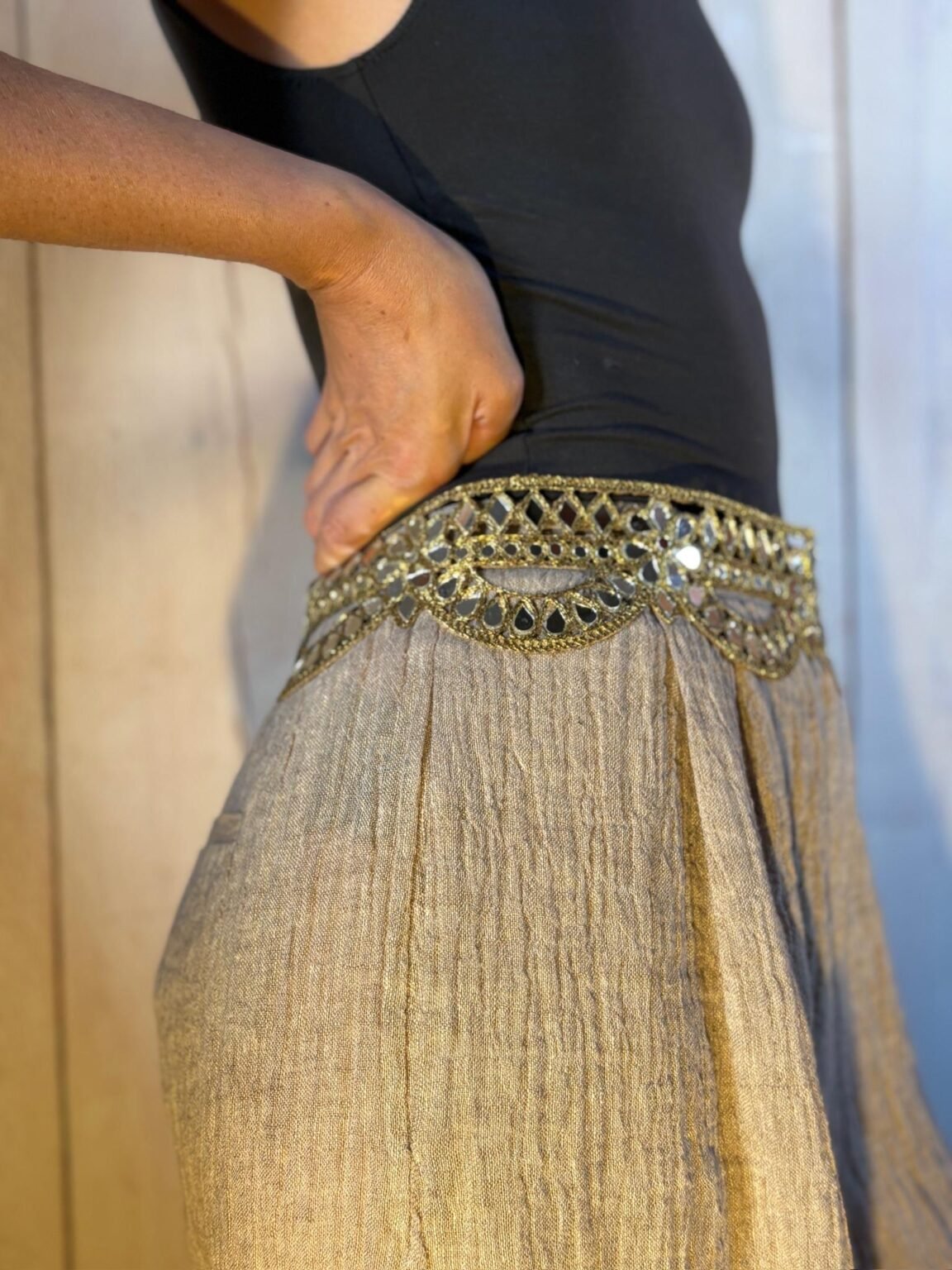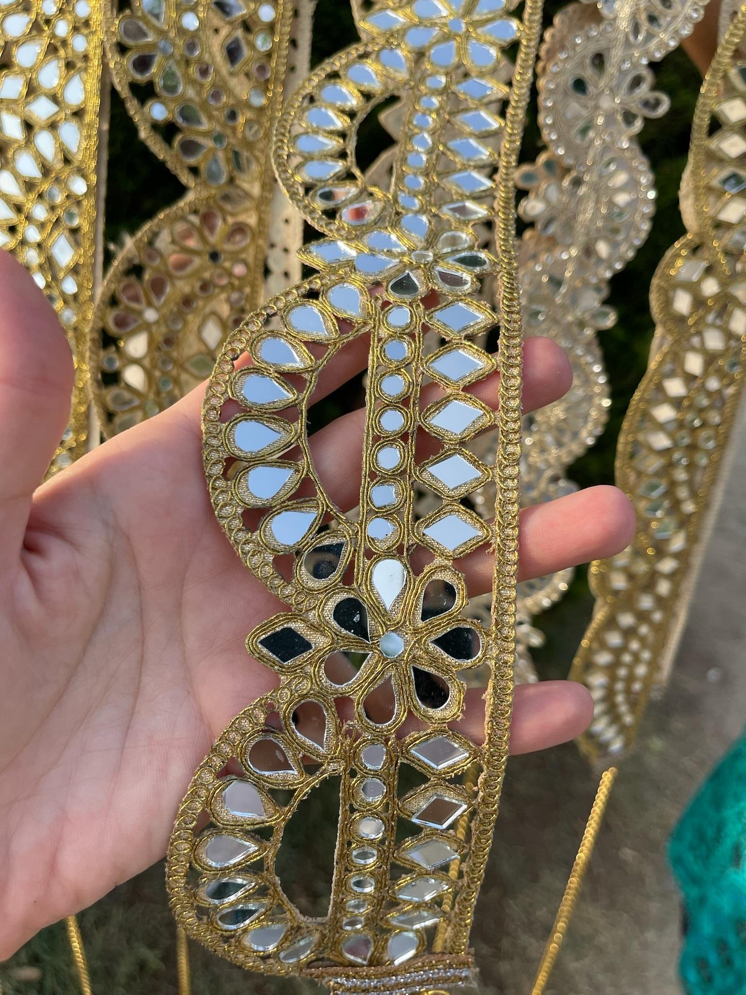 Este hermoso cinturón de ondas está confeccionado con detalles en hilo dorado y pequeños espejos incrustados, que reflejan la luz maravillosamente. Cada pieza está cuidadosamente bordada, lo que la convierte en un accesorio único y lleno de encanto.