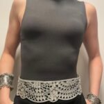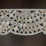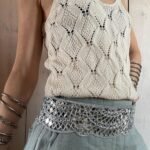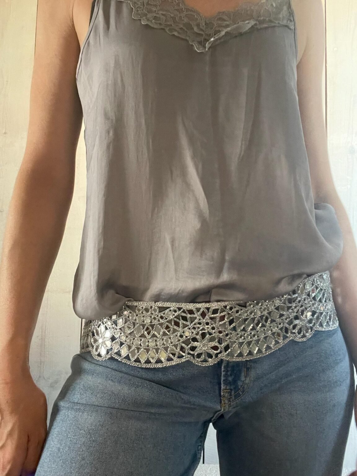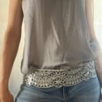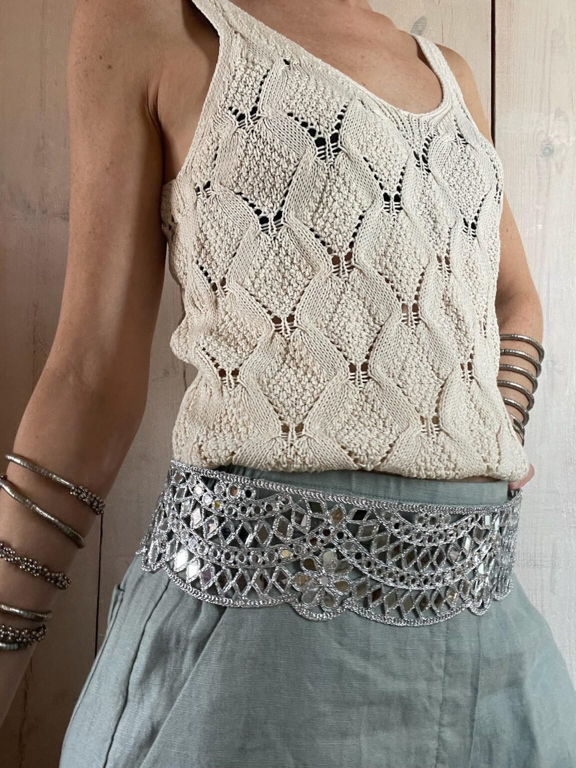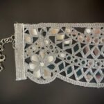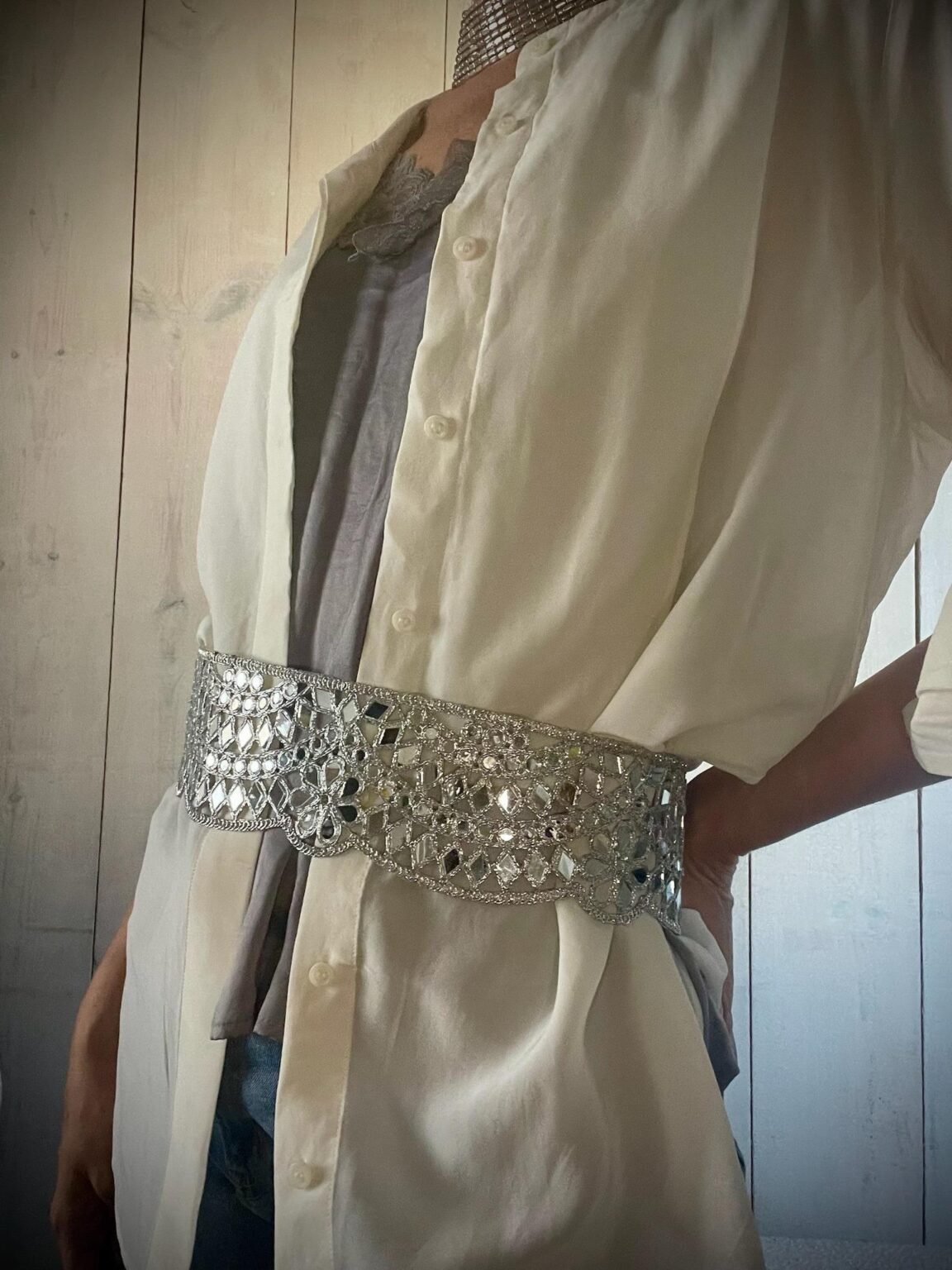 Este hermoso cinturón de ondas está confeccionado con detalles en hilo plateado y pequeños espejos incrustados, que reflejan la luz maravillosamente. Cada pieza está cuidadosamente bordada, lo que la convierte en un accesorio único y lleno de encanto.