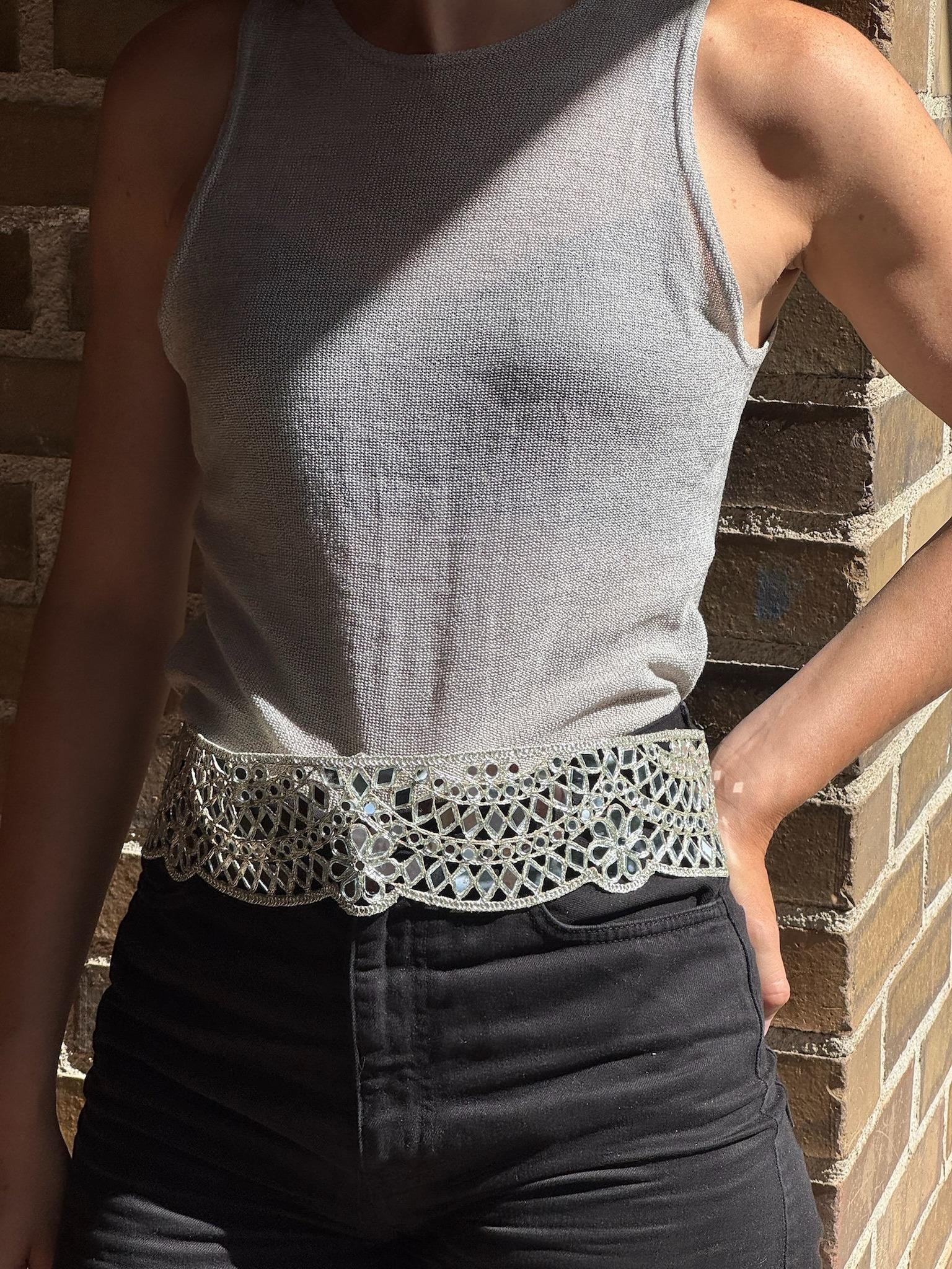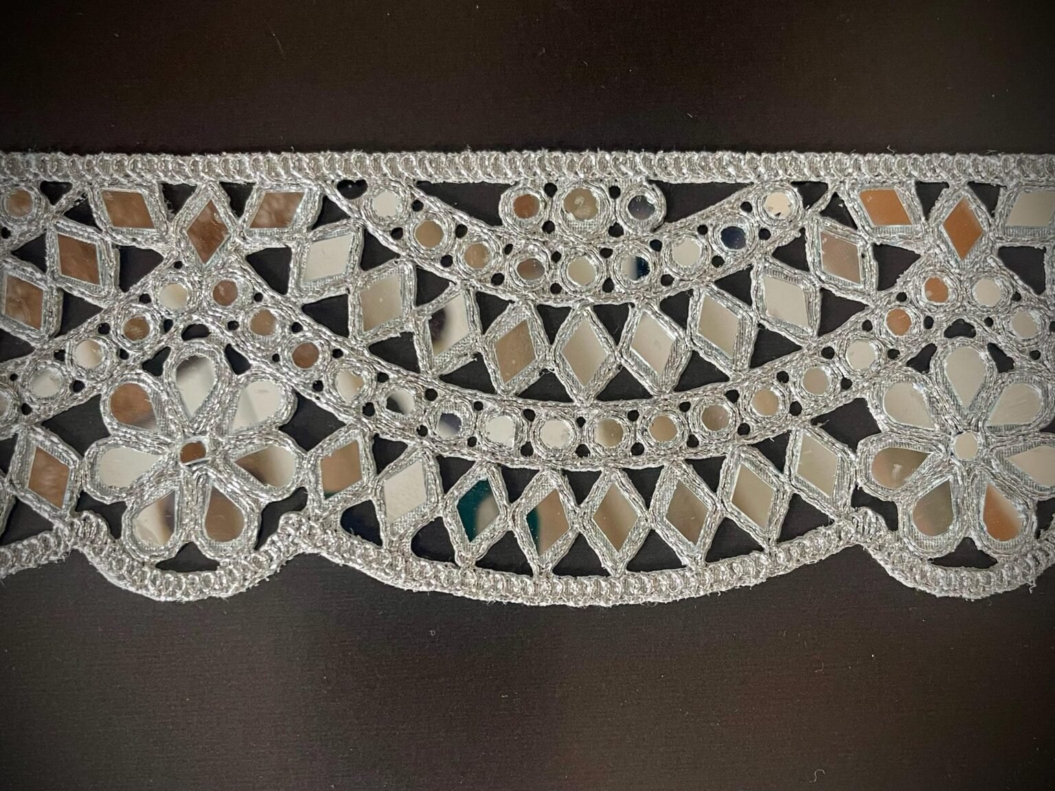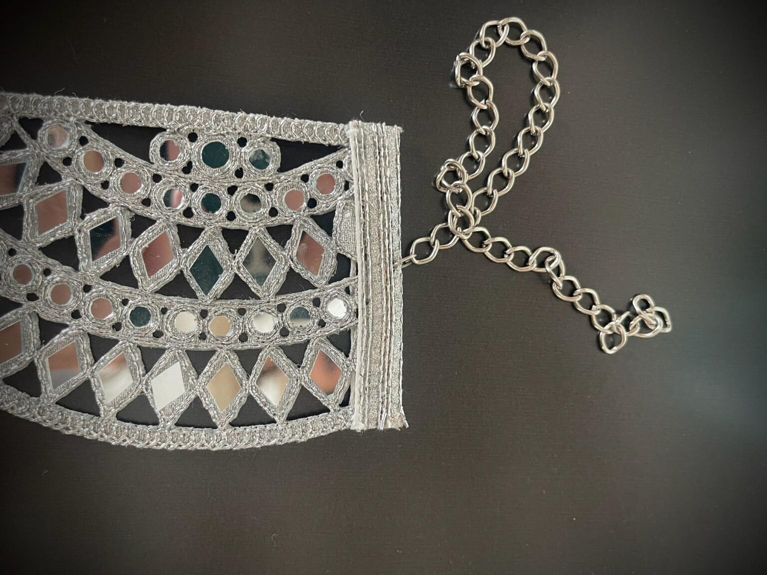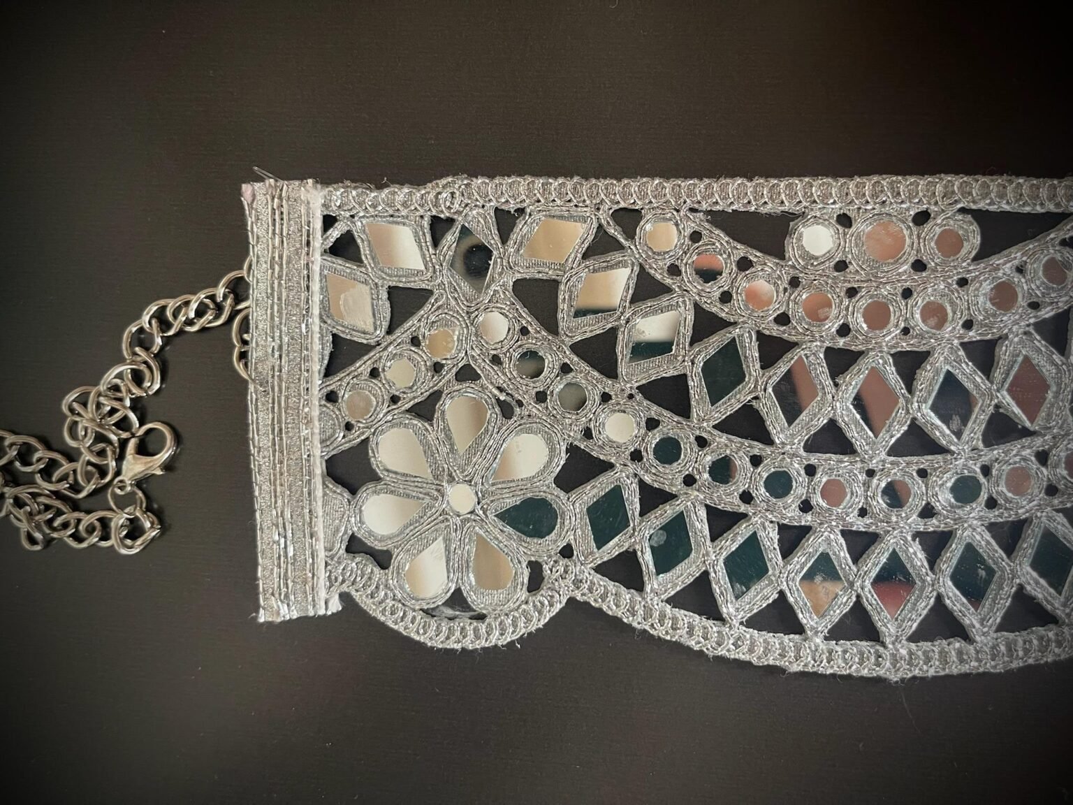 • Material: Base de tela con bordado plateado, espejos pequeños y cadena plateada.