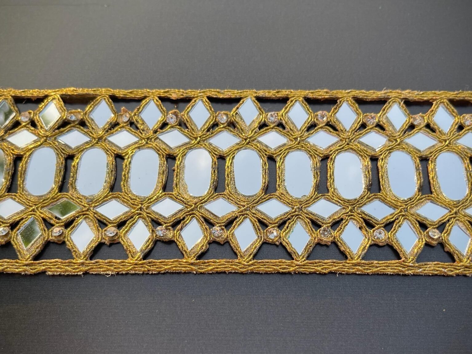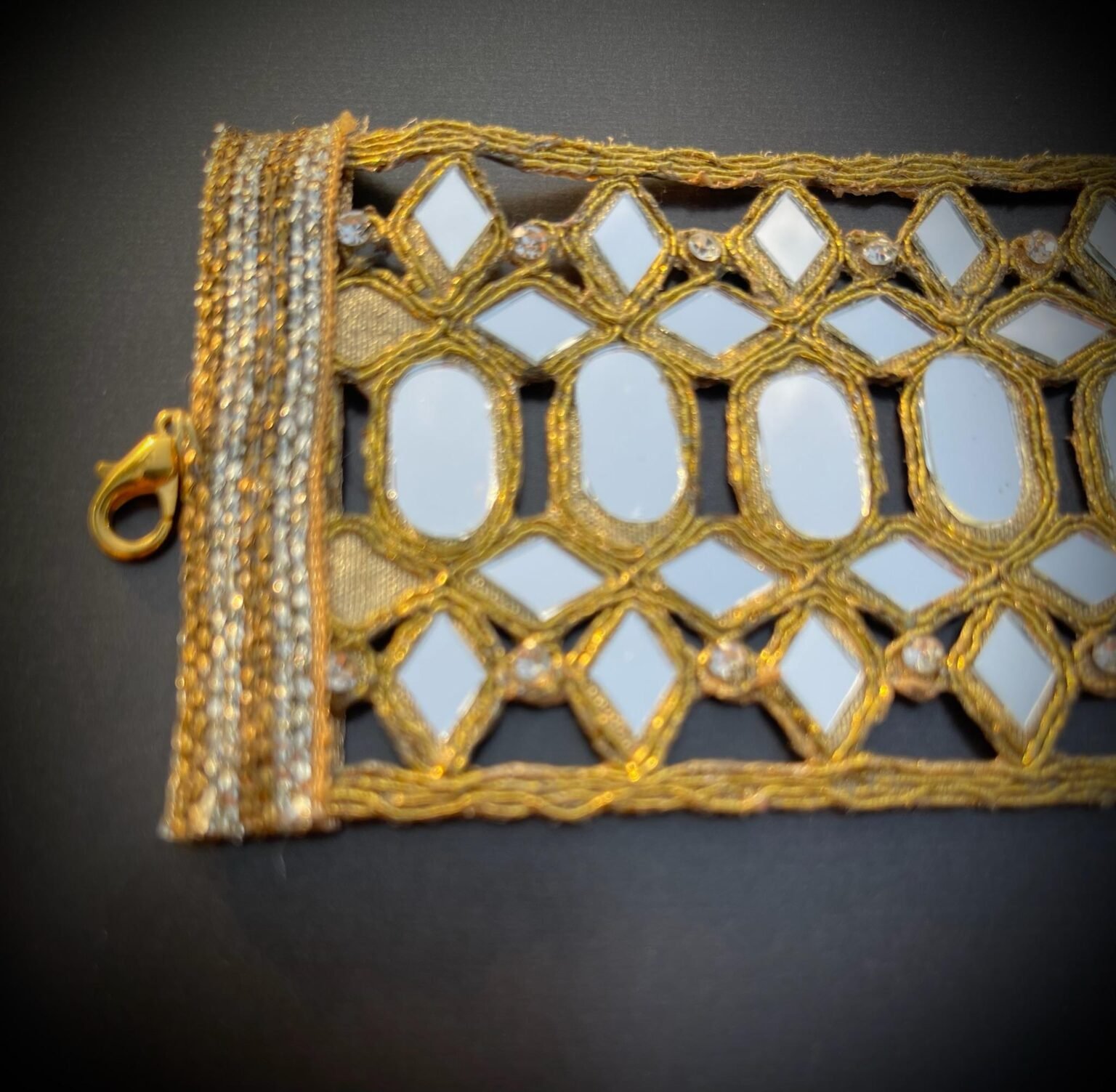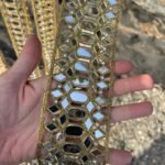 • Material: Base de tela con bordado dorado, espejos pequeños y cadena dorada