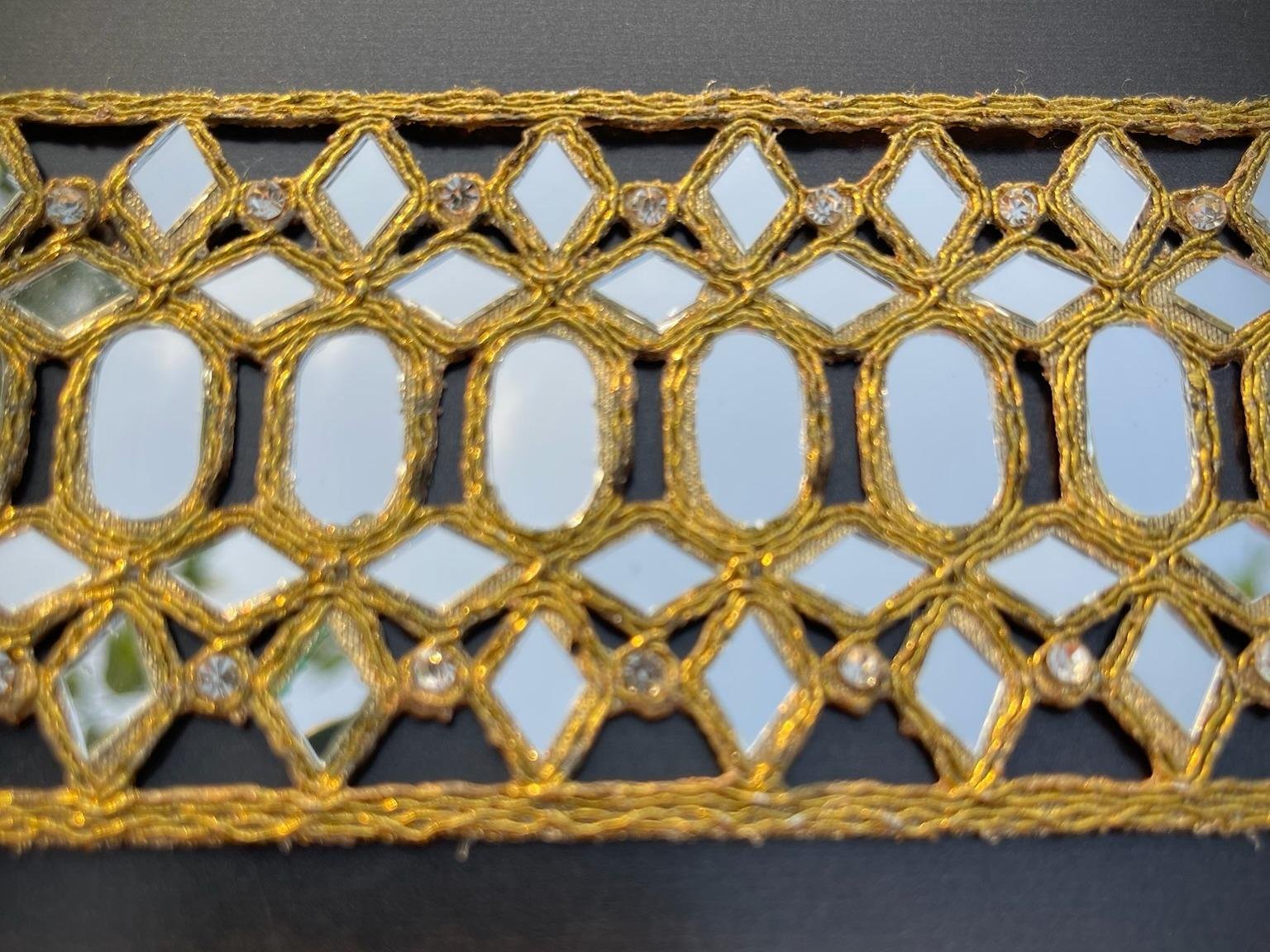 Este hermoso cinturón de diseño recto está confeccionado con detalles en hilo dorado y pequeños espejos incrustados, que reflejan la luz maravillosamente. Cada pieza está cuidadosamente bordada, lo que la convierte en un accesorio único y lleno de encanto.