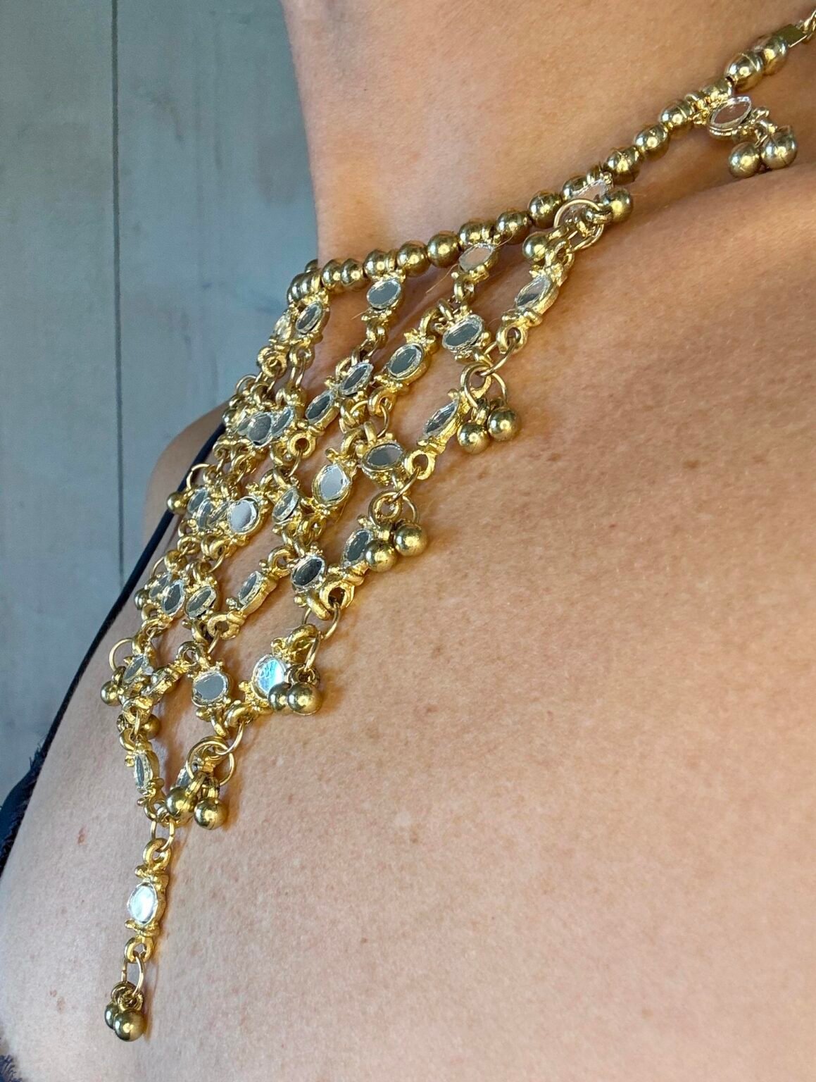 Deslumbra con este collar de cadena dorada y detalles tipo espejo que reflejan la luz con cada movimiento. Artesanal, ajustable y lleno de personalidad, es ideal para fiestas, eventos o para dar un toque glam a cualquier look. Una pieza única que convierte tu outfit en puro brillo y estilo. ✨