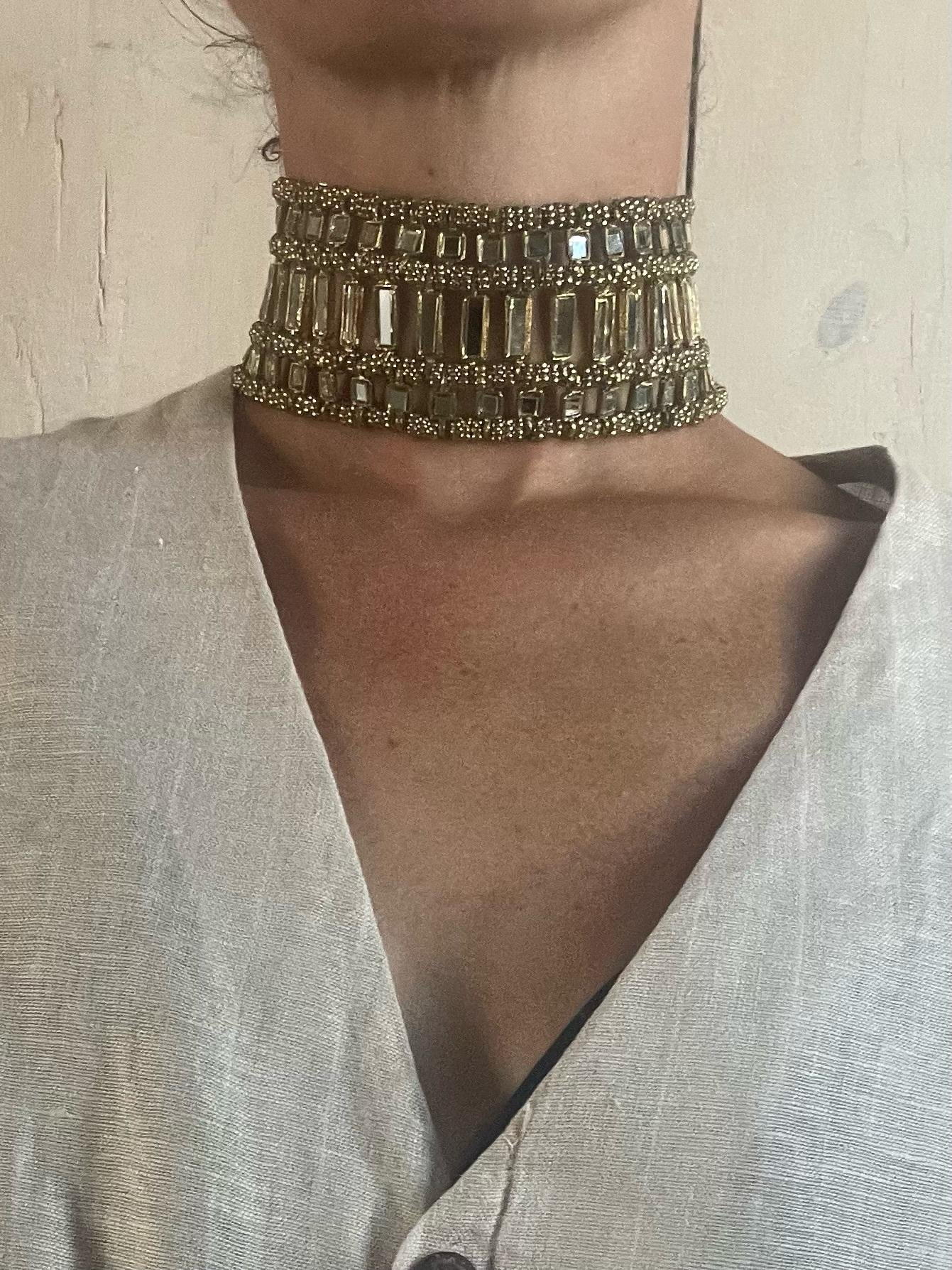 Impacta con esta gargantilla de eslabones dorados y cristales que reflejan la luz con cada movimiento. Hecha a mano y ajustable, es el accesorio perfecto para dar un toque audaz y glamuroso a cualquier look. Ideal para eventos, fiestas o para destacar incluso con un outfit básico. ✨