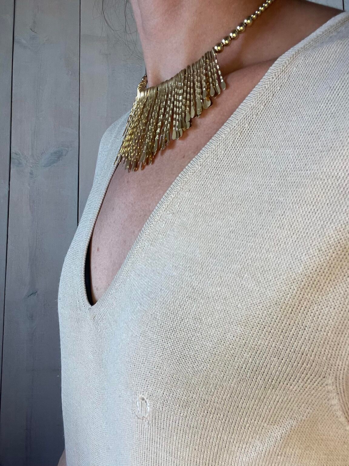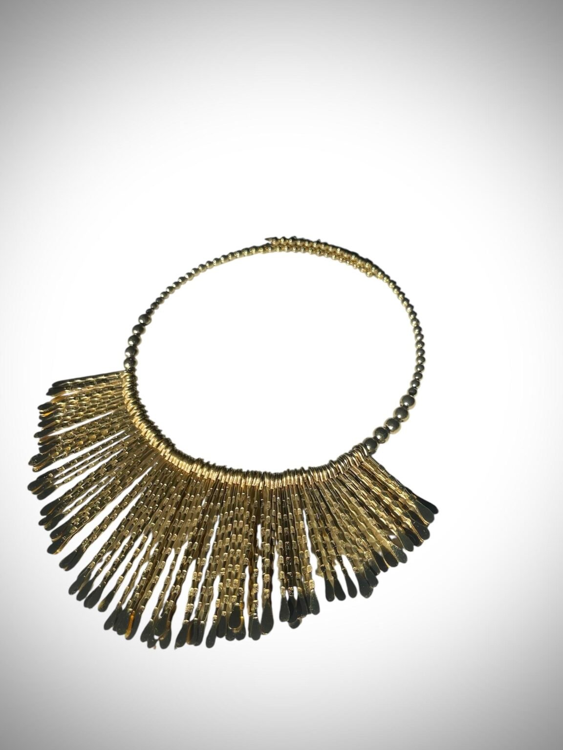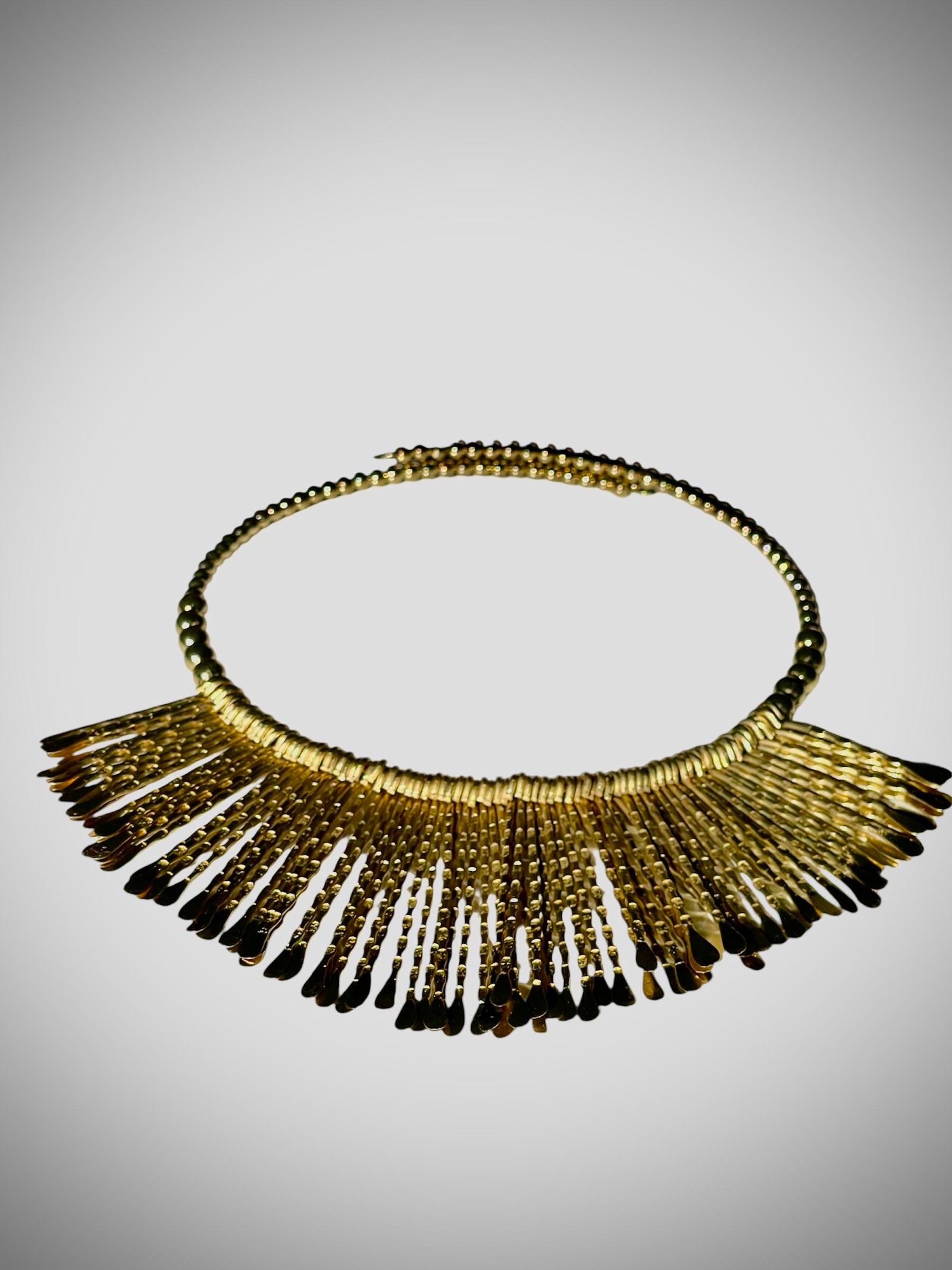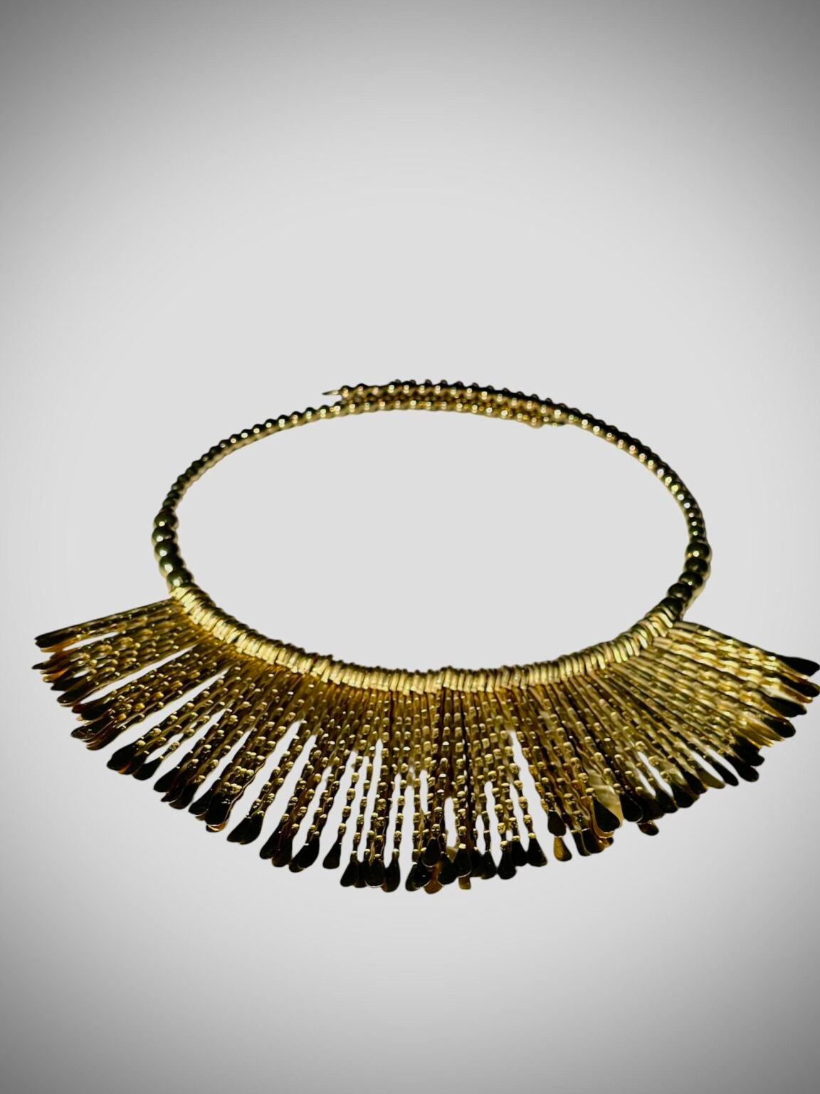 ✨ Luce como una reina con nuestro Collar de Cadena Malla Faraona de Flor. Una pieza impresionante que fusiona elegancia y poder. Su diseño artesanal en forma de malla floral dorada evoca la majestuosidad del antiguo Egipto, creando un efecto de red brillante que realza cualquier escote.